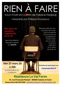 Spectacle à Lyon : “Rien à faire” le 27 mars à Caluire-et-Cuire 13 mars 2026 Vous cherchez un spectacle à Lyon original et marquant ? Le vendredi 27 mars 2026 à 20h, la Résidence Le Val Foron accueille le spectacle Rien à faire, interprété par Philippe Rousseaux et écrit par Fabrice Hadjadj. Située à Caluire-et-Cuire, à quelques minutes de Lyon, la résidence ouvre exceptionnellement ses portes au public pour une soirée culturelle mêlant humour, poésie et réflexion. Ce spectacle propose une expérience théâtrale à la fois drôle et profondément humaine. Un spectacle de clown entre humour et profondeur Avec Rien à faire, le public découvre le personnage de Pol Bouchard, un clown attachant qui explore les grandes questions de l’existence. Entre éclats de rire et moments plus sensibles, le spectacle aborde avec finesse des thèmes universels : la joie d’exister, la fragilité de la vie et la quête de sens. Le spectacle réussit le pari rare de faire rire tout en invitant à réfléchir. Sur scène, Philippe Rousseaux porte seul ce spectacle avec énergie et émotion. Sa performance donne vie à un clown à la fois drôle, touchant et profondément humain. Ce seul-en-scène crée une relation directe avec les spectateurs et transforme la soirée en un moment de théâtre intime et vibrant. Prévoir comment s’y rendre. Spectacle à Lyon et une soirée culturelle à la résidence Val Foron La représentation aura lieu à la Résidence Le Val Foron, un lieu de vie qui organise régulièrement des événements culturels ouverts au public. En accueillant ce spectacle, la résidence souhaite favoriser les rencontres et proposer une sortie culturelle originale près de Lyon. La représentation s’adresse principalement à un public adulte, sensible à l’humour et aux questionnements philosophiques. Si vous vous demandez quel spectacle aller voir à Lyon, cette proposition artistique offre une alternative originale aux programmations théâtrales classiques. Informations pratiques Date : vendredi 27 mars 2026 Heure : 20h Lieu : Résidence Le Val Foron Adresse : 51 rue François Peissel, 69300 Caluire-et-Cuire Participation : au chapeau Public : adultes La participation au chapeau permet à chacun de contribuer librement à cette soirée artistique. Réservation obligatoire : anicaluire@asso-lesbruyeres.org Découvrir la résidence Le Val Foron ici. FAQ du Spectacle à Lyon « Rien à faire » Où voir le spectacle « Rien à faire » à Lyon ? Le spectacle est présenté à la Résidence Le Val Foron, située à Caluire-et-Cuire, à quelques minutes de Lyon. Ce lieu accueille régulièrement des événements culturels ouverts au public. Quel spectacle aller voir à Lyon le 27 mars 2026 ? Le spectacle « Rien à faire », interprété par Philippe Rousseaux et écrit par Fabrice Hadjadj, est une proposition originale mêlant humour, poésie et réflexion sur le sens de la vie. Le spectacle est-il accessible à tous les publics ? Ce spectacle s’adresse principalement à un public adulte, car il aborde avec humour et sensibilité des questions existentielles et philosophiques. Comment réserver pour le spectacle à la résidence Val Foron ? La réservation est obligatoire et se fait par email à l’adresse suivante : anicaluire@asso-lesbruyeres.org. Faut-il payer une entrée pour assister au spectacle ? La participation se fait « au chapeau ». Chacun est libre de donner la contribution qu’il souhaite pour soutenir l’artiste et l’organisation de l’événement. Pourquoi assister à ce spectacle à Caluire-et-Cuire ? Ce spectacle propose une expérience théâtrale unique, mêlant rire et réflexion. C’est également l’occasion de découvrir une sortie culturelle originale près de Lyon dans un cadre convivial.